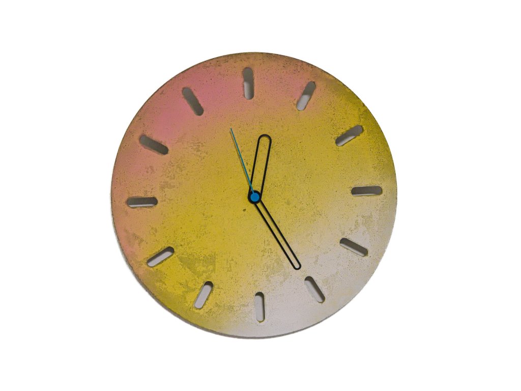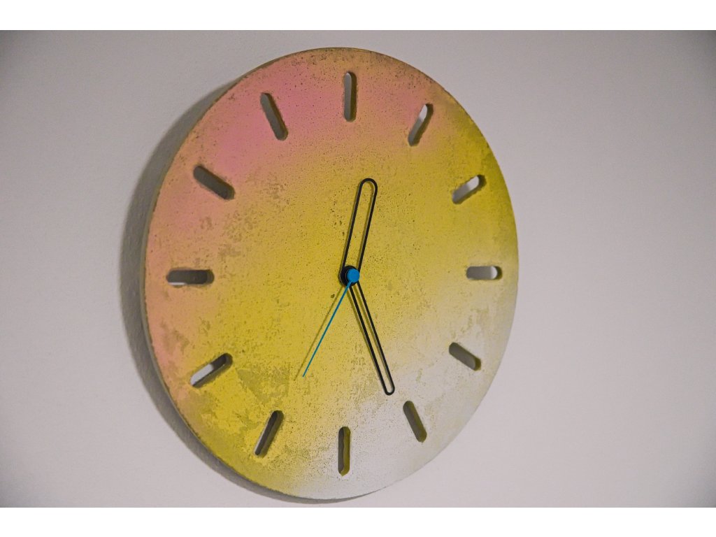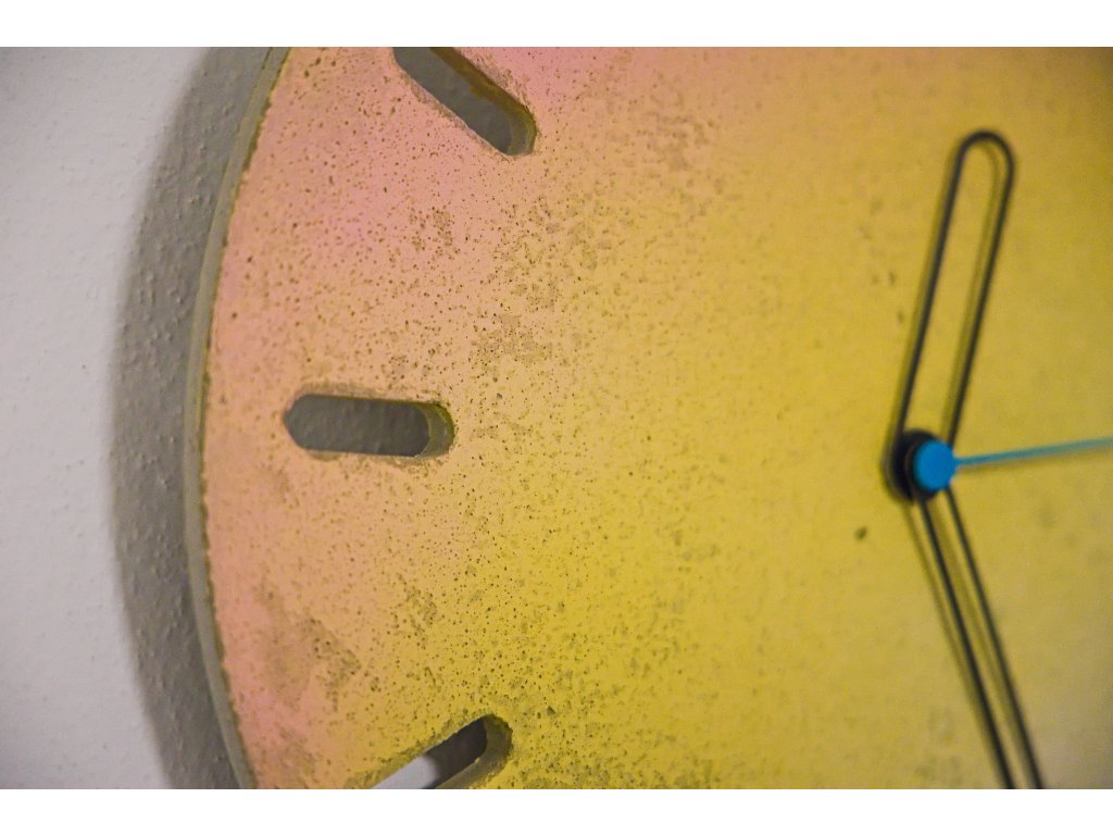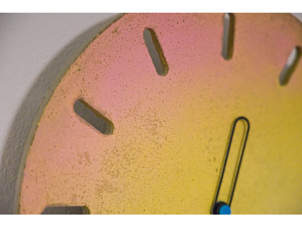 Ciferník – kruh o průměru 31 cm, barva šedá, žlutá a růžová, materiál - mikrobetonové stěrka.